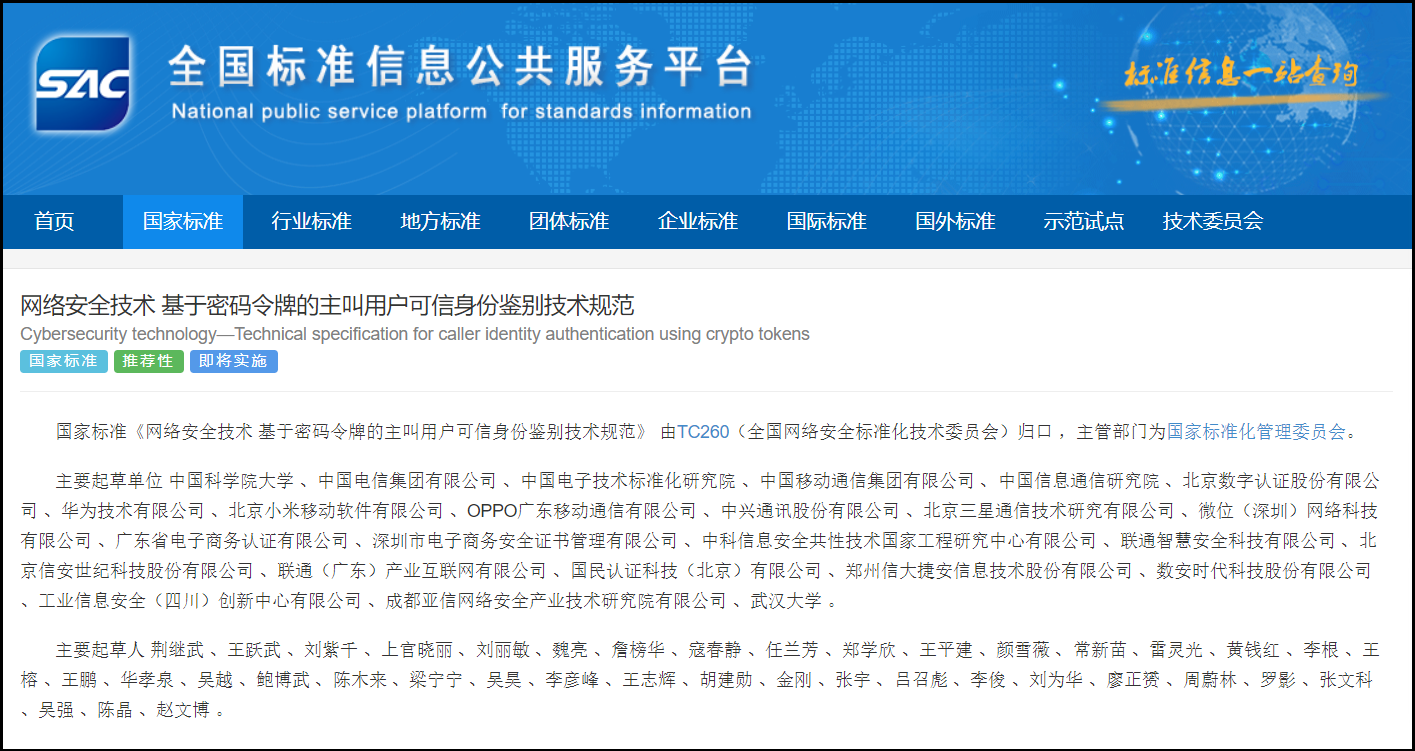 可信通信國(guó)家標(biāo)準(zhǔn)的研制歷經(jīng)4年時(shí)間,2020年廣東省電子商務(wù)認(rèn)證有限公司(簡(jiǎn)稱(chēng)網(wǎng)證通NETCA)與中國(guó)科學(xué)院大學(xué)、微位科技聯(lián)合開(kāi)展了"基于密碼令牌的可信通信服務(wù)技術(shù)規(guī)范"國(guó)家標(biāo)準(zhǔn)研究課題,基于該課題研究成果,2021年《信息安全技術(shù)基于密碼令牌的主叫用戶(hù)可信身份鑒別技術(shù)規(guī)范》國(guó)家標(biāo)準(zhǔn)的制定工作正式啟動(dòng),網(wǎng)證通NETCA作為主要起草單位不僅積極參與標(biāo)準(zhǔn)的制定,還與中國(guó)科學(xué)院大學(xué)、中國(guó)電信等單位聯(lián)合開(kāi)展了國(guó)家標(biāo)準(zhǔn)試點(diǎn)工作。
