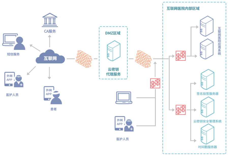 ● 云服務(wù):若互聯(lián)網(wǎng)醫(yī)院應(yīng)用系統(tǒng)本身也是在云端,不方便部署硬件設(shè)備的情況,網(wǎng)證通可提供云服務(wù)方式接入