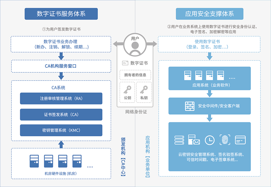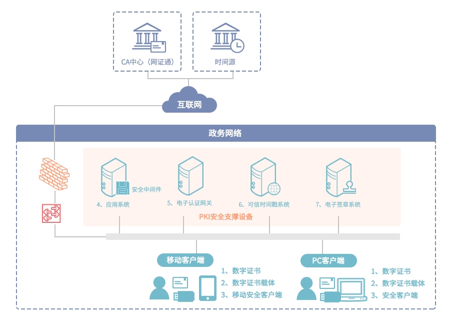 根據企業的需求,在企業內部網絡上部署簽名驗簽服務器、可信時間戳服務器、電子簽章服務器等設備,在應用系統中集成PKI安全中間件,在PC客戶端或移動客戶端安全相應的網證通安全客戶端軟件,再適配相應的數字證書介質,就完成整個方案的部署。